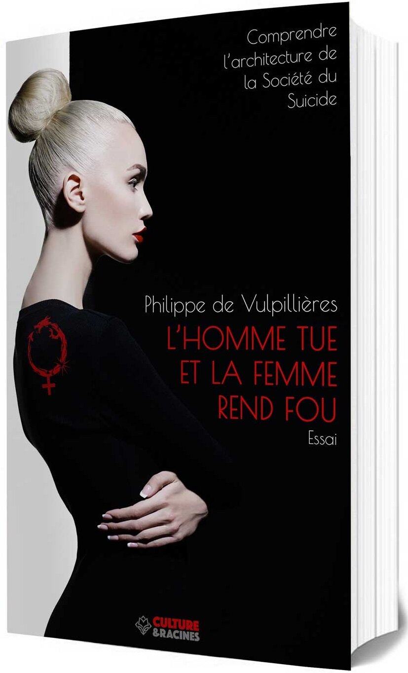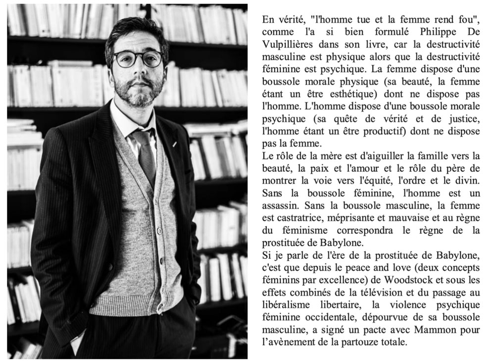 « En vérité, « l'homme tue et la femme rend fou », comme l'a si bien formulé Philippe De Vulpillières dans son livre, car la destructivité masculine est physique alors que la destructivité féminine est psychique. La femme dispose d'une boussole morale physique (sa beauté, la femme étant un être esthétique) dont ne dispose pas l'homme. L'homme dispose d'une boussole morale psychique (sa quête de vérité et de justice, l'homme étant un être productif) dont ne dispose pas la femme. Le rôle de la mère est d'aiguiller la famille vers la beauté, la paix et l'amour et le rôle du père de montrer la voie vers l'équité, l'ordre et le divin. Sans la boussole féminine, l'homme est un assassin. Sans la boussole masculine, la femme est castratrice, méprisante et mauvaise et au règne du féminisme correspondra le règne de la prostituée de Babylone. Si je parle de l'ère de la prostituée de Babylone, c'est que depuis le « Peace & Love » (deux concepts féminins par excellence) de Woodstock et sous les effets combinés de la télévision et du passage au libéralisme libertaire, la violence psychique féminine occidentale, dépourvue de sa boussole masculine, a signé un pacte avec Mammon pour l'avènement de la partouze totale. »