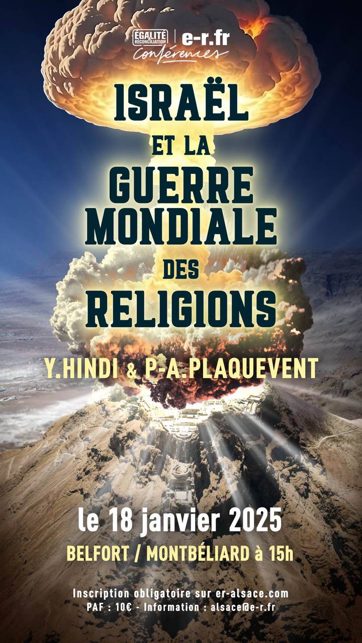 La section Égalité & Réconciliation Alsace vous donne rendez-vous à 15h00, le samedi 18 janvier 2025 aux environs de Belfort/Montbéliard pour une conférence. Le lieu exact de l’évènement sera communiqué par mail et SMS le jour même en début de mâtinée aux inscrits ayant effectué leur règlement.