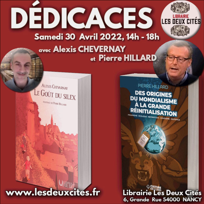 Publié le : 21/04/2022 Pierre Hillard et Alexis Chevarnay en dédicace à la librairie « Les deux cités » le 30 avril 2022 - Catégories : Actualité C&R / Événements , Auteurs , Dédicaces / Conférences , Pierre Hillard