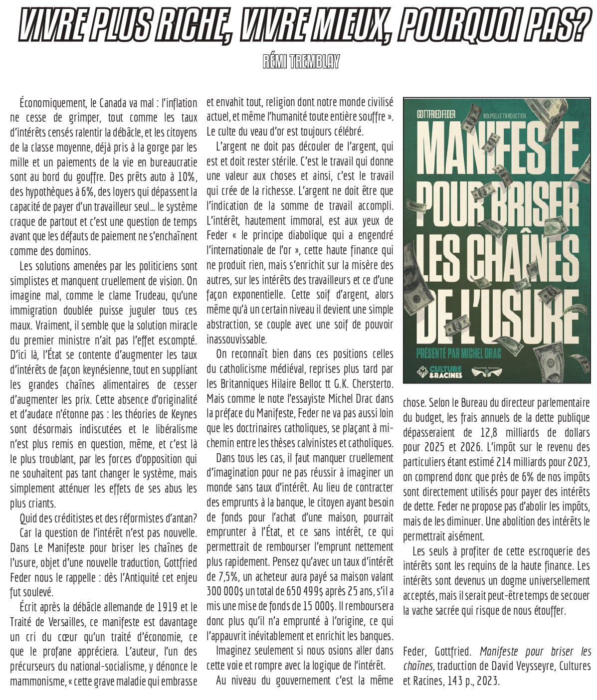 Publié le : 11/04/2024 Vivre plus riche, vivre mieux, pourquoi pas ? I Recension du « Manifeste pour briser les chaînes de l’usure » - Catégories : Actualité C&R / Événements , Auteurs , Presse (Recensions, tribunes, mentions) Une recension de Remi Tremblay dans le dernier numéro de la revue Le Harfang (N°12, printemps 2024).