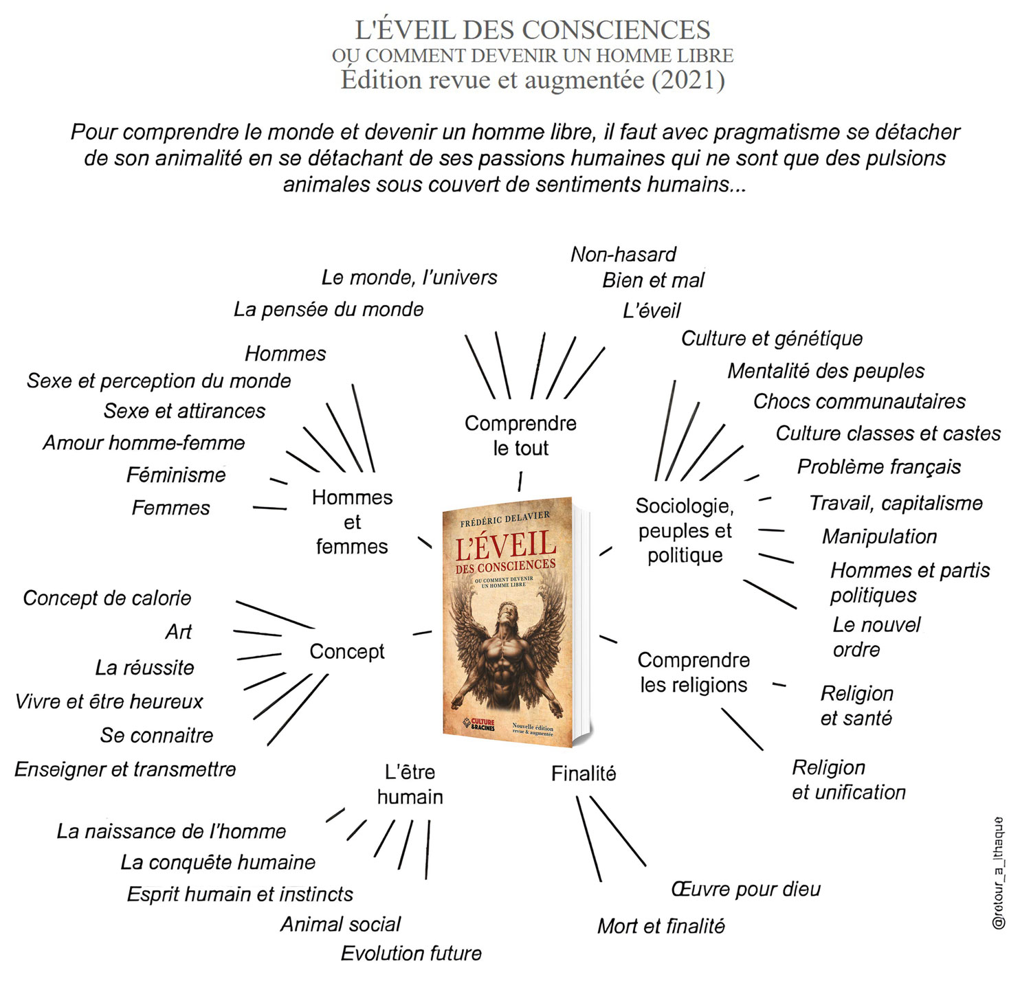 Partant d'une étude de l'évolution de l'anatomie humaine, l'auteur détaille son point de vue sur de nombreux sujets contemporains tels que le féminisme, la religion ou la lutte des classes, pour offrir à l'homme une vision énergétique des relations et comportements afin d'éveiller sa conscience ».