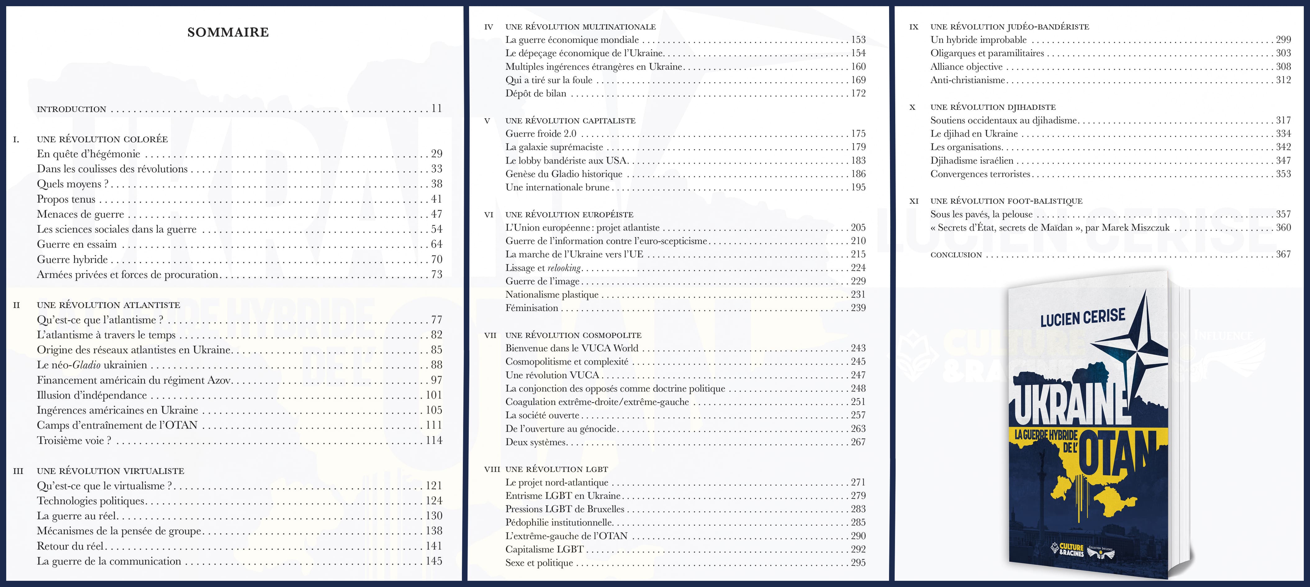L'auteur analyse l'histoire récente de l'Ukraine jusqu'à la révolution de Maïdan à l'hiver 2013-2014, présentée comme une lutte d'émancipation nationale alors qu'elle n'est, selon lui, qu'une opération coloniale menée par l'Otan et l'Europe. Il défend une transformation politique autonome qui pourrait s'opposer à cette alliance droite-gauche-islam sous contrôle des puissances étrangères. »